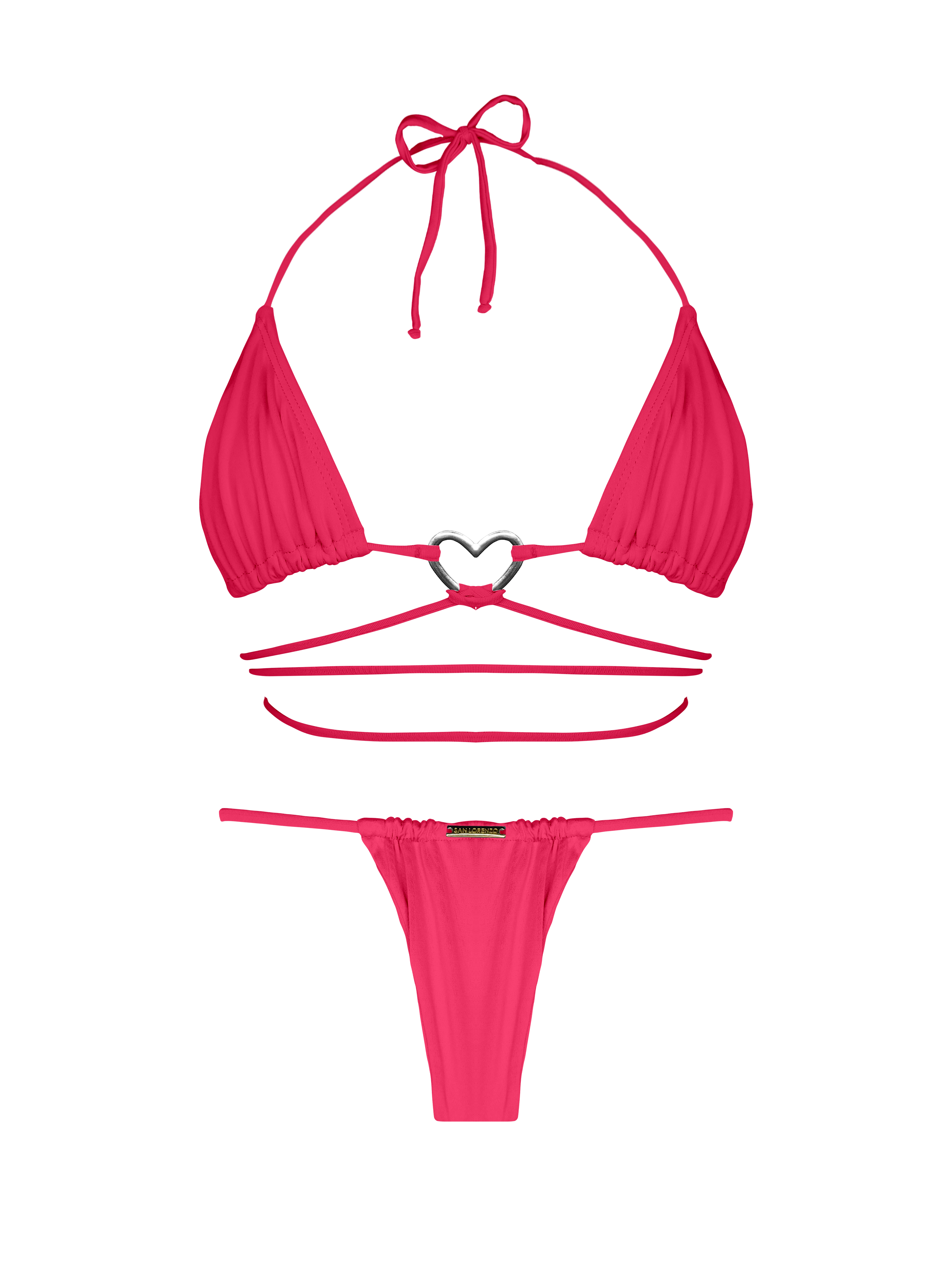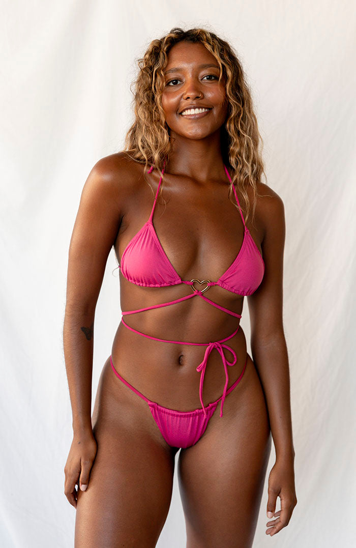 The Multi String Bikini Top is a playful twist on our classic triangle halter tops. This bikini boasts a silver heart accent and offers an additional string for versatile styling options. Your creativity decides how you personalize this top!