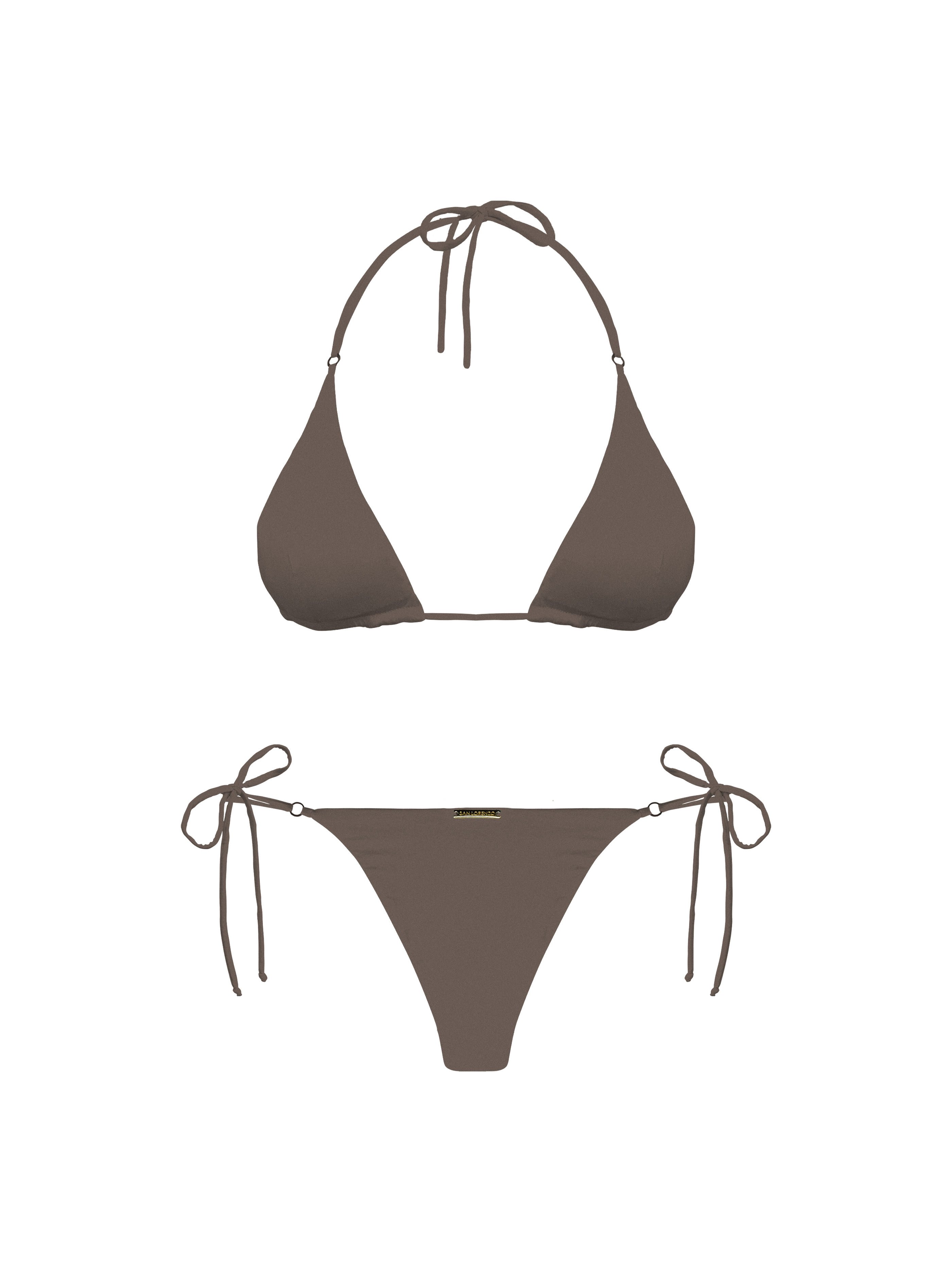 This classic string triangle top, worthy of swooning, has received a playful makeover. What sets this style apart is its charmingly adorable touch – delicate gold accents gracefully adorning both the sides and the top. The strings on the top invite a playful interaction – crisscross them or rearrange them at will, courtesy of the looped metal element. Seamlessly designed and reversible, it conforms snugly to your body like a second skin, ensuring a perfect fit that's simply unparalleled.