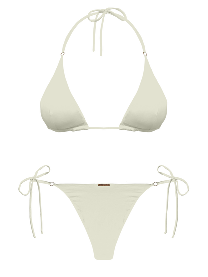 This classic string triangle top, worthy of swooning, has received a playful makeover. What sets this style apart is its charmingly adorable touch – delicate gold accents gracefully adorning both the sides and the top. The strings on the top invite a playful interaction – crisscross them or rearrange them at will, courtesy of the looped metal element. Seamlessly designed and reversible, it conforms snugly to your body like a second skin, ensuring a perfect fit that's simply unparalleled.